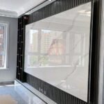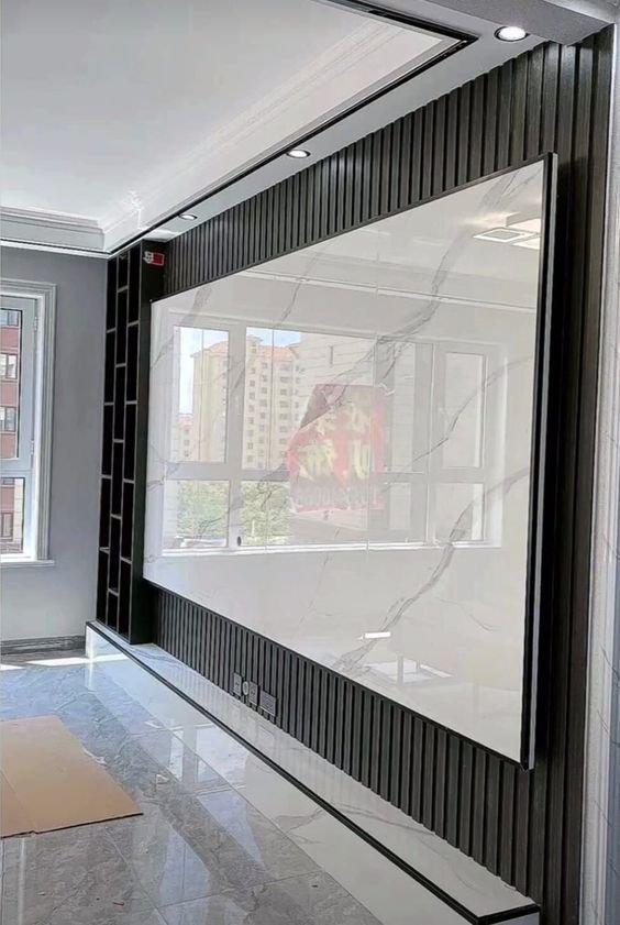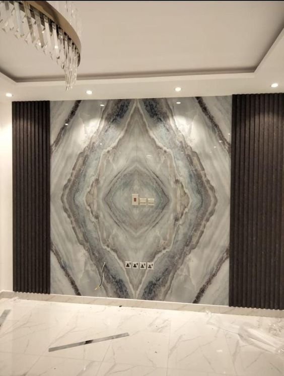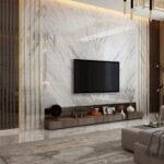 يُضفي بديل الرخام خلف التلفزيون لمسة فخامة واضحة، خاصة عند دمجه مع الإضاءة المخفية أو الألوان الداكنة.